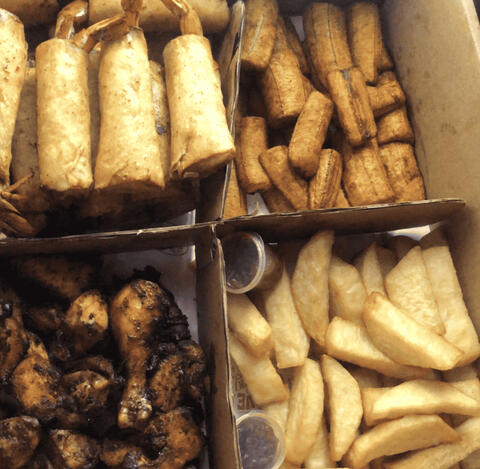 | Jumbo Box | 2 Chicken, 2 Turkey, 2 Shish Kebab, 1 Snail Kebab, 1 Corn On Cob, 4 Portions Of Yam, 4 Portions Of Plantian & Fresh Pepper Sauce | 12,000 |